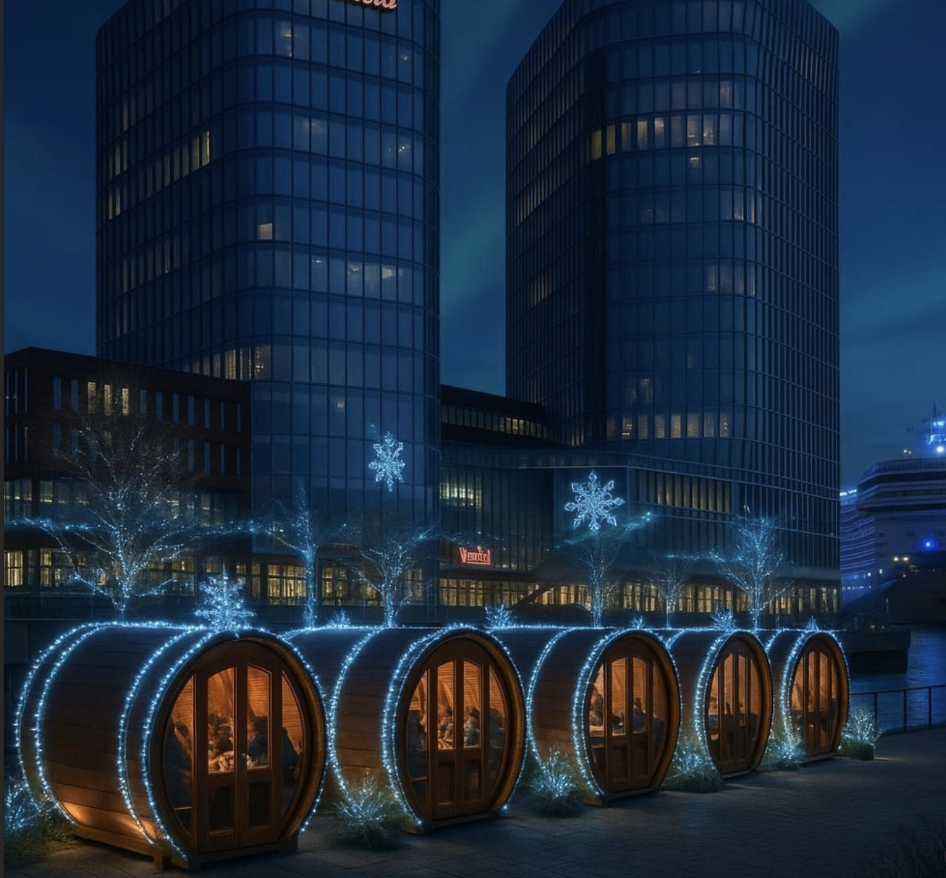 Zauberhafter Lichterglanz und grenzenloser Genuss: Bei uns erlebst Du Dein individuelles Weihnachtsessen im gemütlichen Holzfass. Natürlich beheizt und mit einmaligem Hafenblick